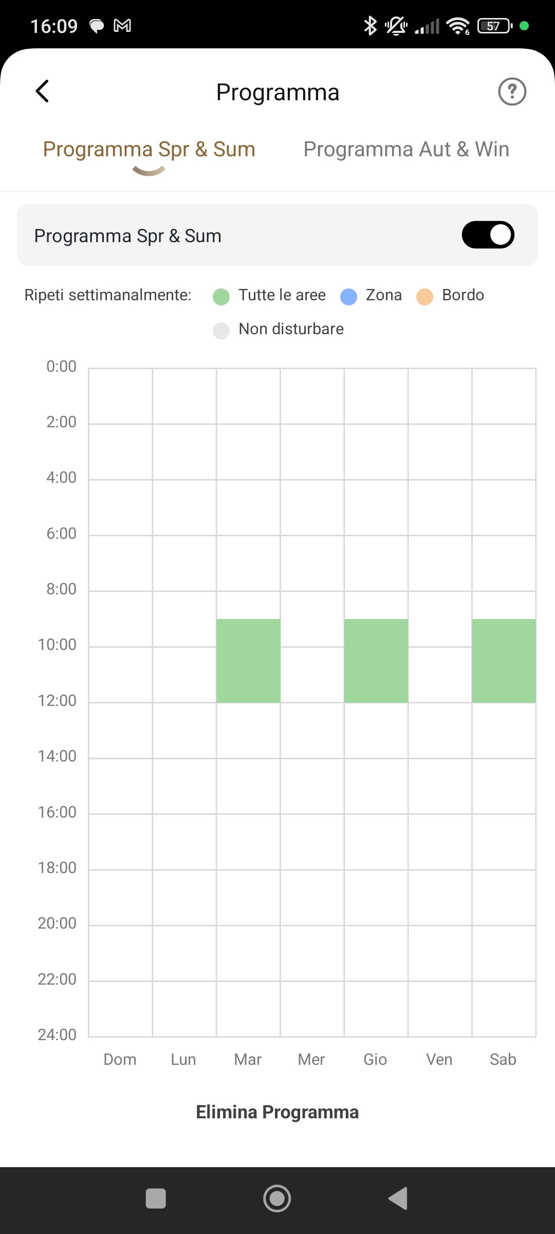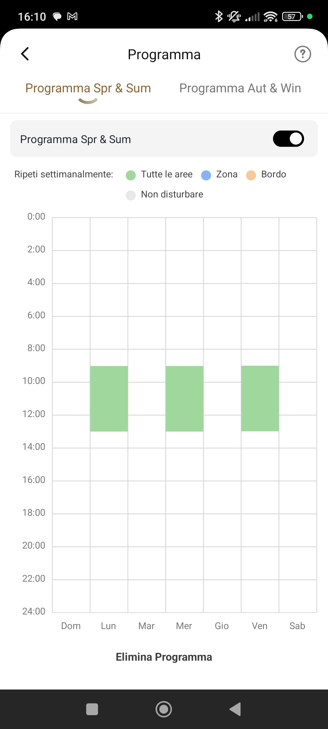 Ad esempio il mio giardino è suddiviso in 3 zone e ho programmato così: lunedì giovedì raso la zona 1, martedì venerdì la zona 2, mercoledì e sabato la zone 3. |