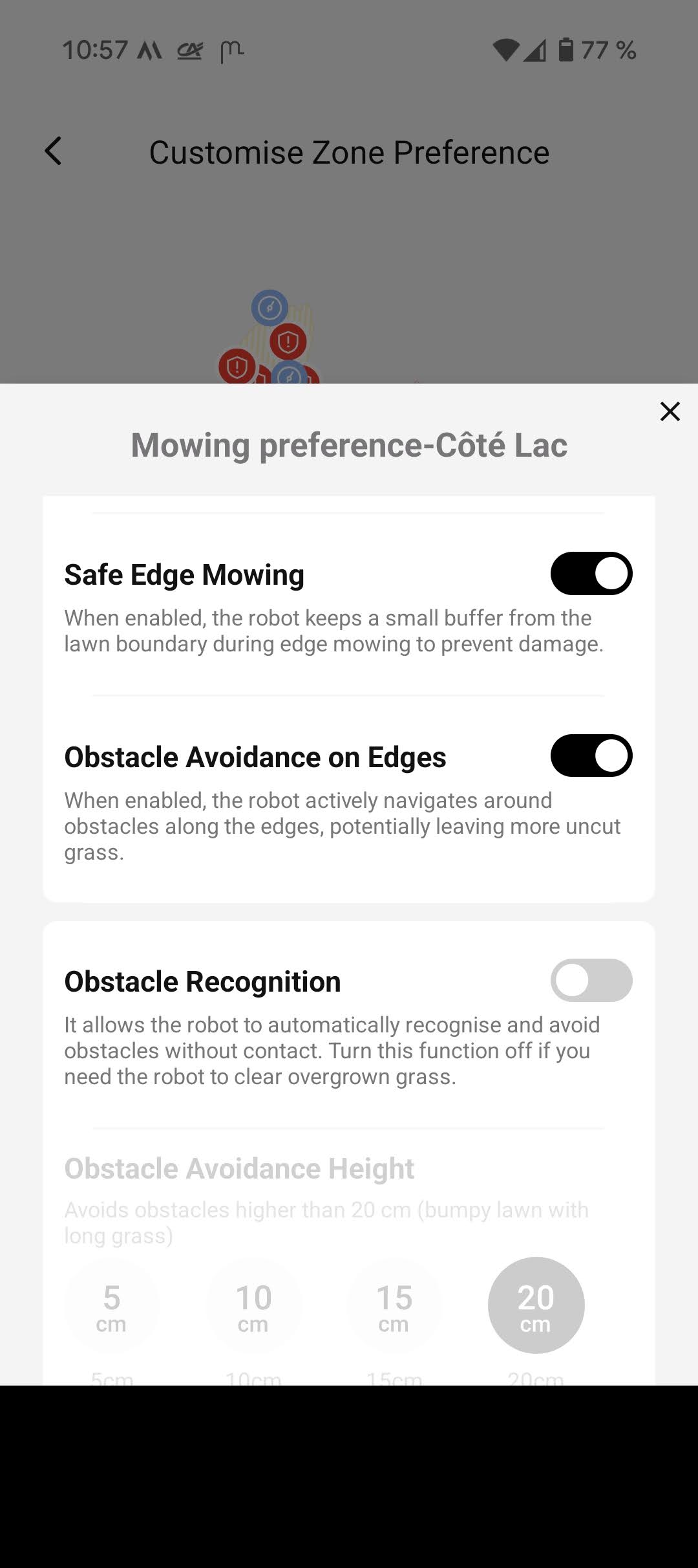 1) In the App settings, we can set the obstacle detection to 20cm, however, the response from support was: "We would like to inform you that the machine may have difficulties mowing effectively grass that exceeds 12 cm in height."