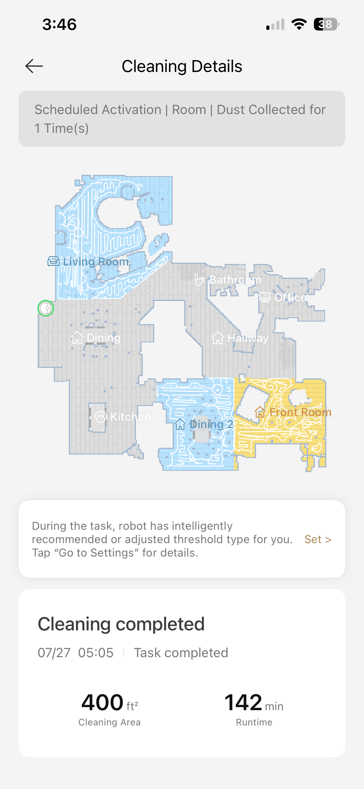 My new unit take multiple hours and multiple recharges to vacuum 400 sq feet. Plus not much dirt ever gets into the bag. Defective? Wrong settings? Seems to mop fine. Just the vacuum that is wonky and slow. Wonders around confused half the time.